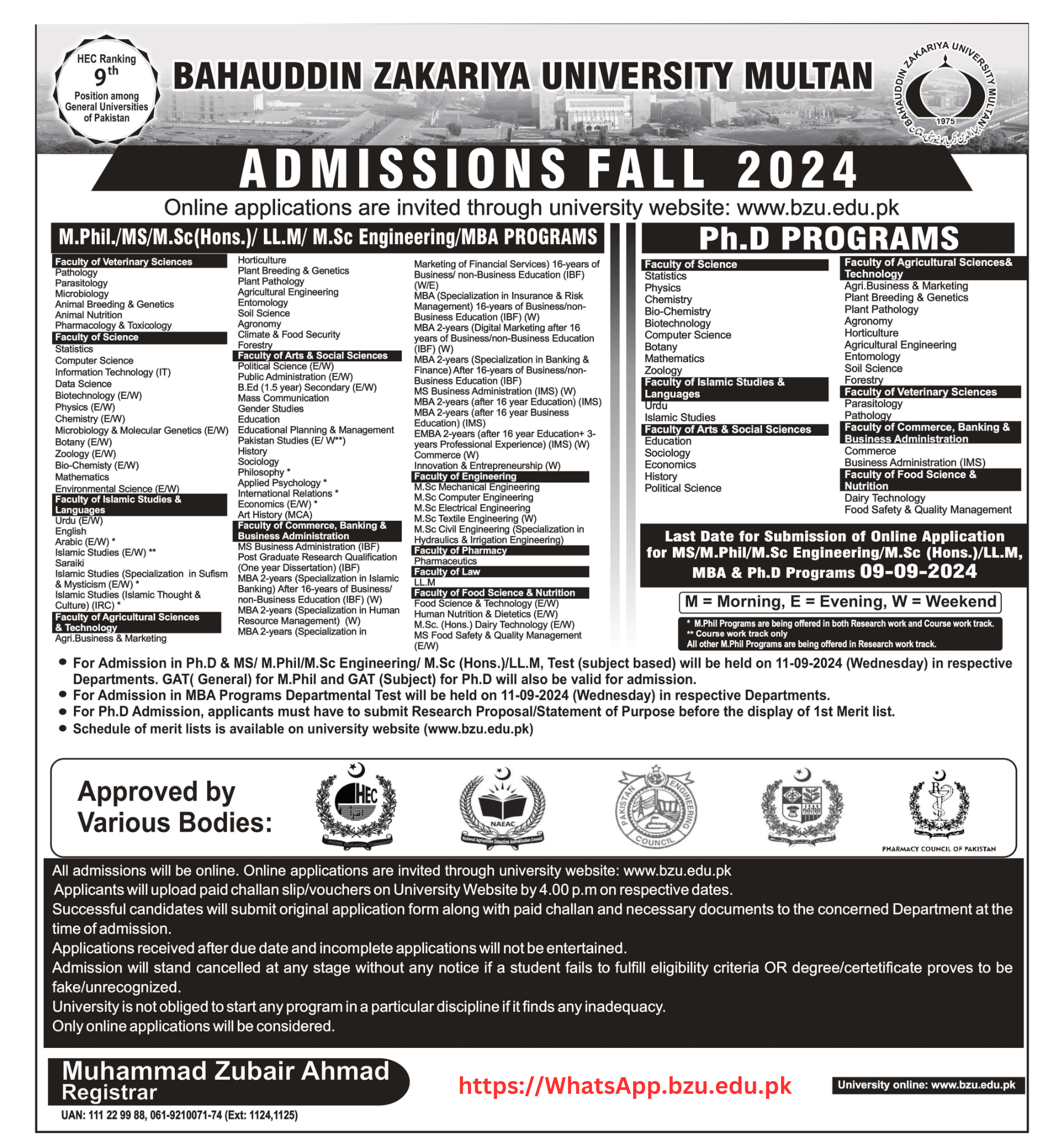 Admission Test for MPhil-PhD Program will be held on September 11, 2024 at the Institute of Botany, B.Z. University Multan
