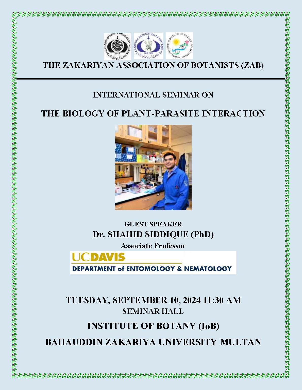 BY THE GUEST SPEAKER Dr. SHAHID SIDDIQUE (PhD) Associate Professor, Department of Entomology and Nematology, UC-Davis California USA.
