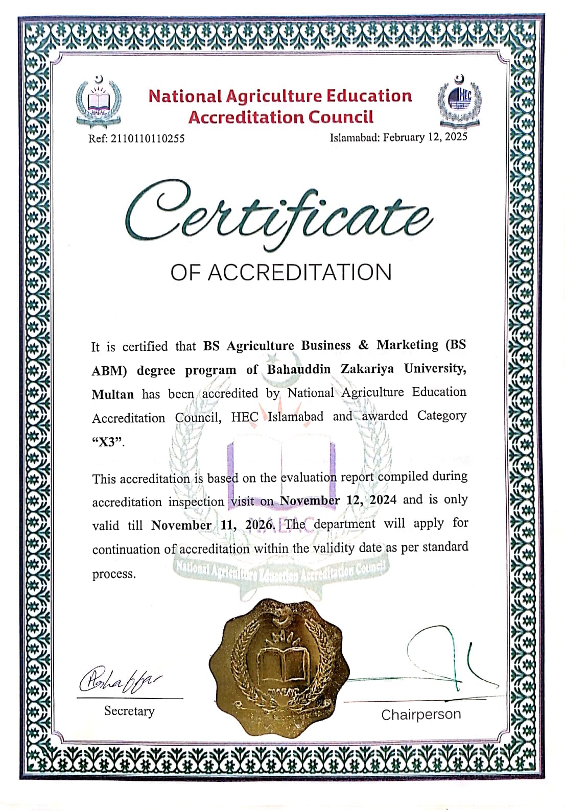 Our BS Agriculture Business & Marketing (BS ABM) program at BZU Multan has been accredited by the National Agriculture Education Accreditation Council (NAEAC), HEC Islamabad with Category "X3"! ✅
