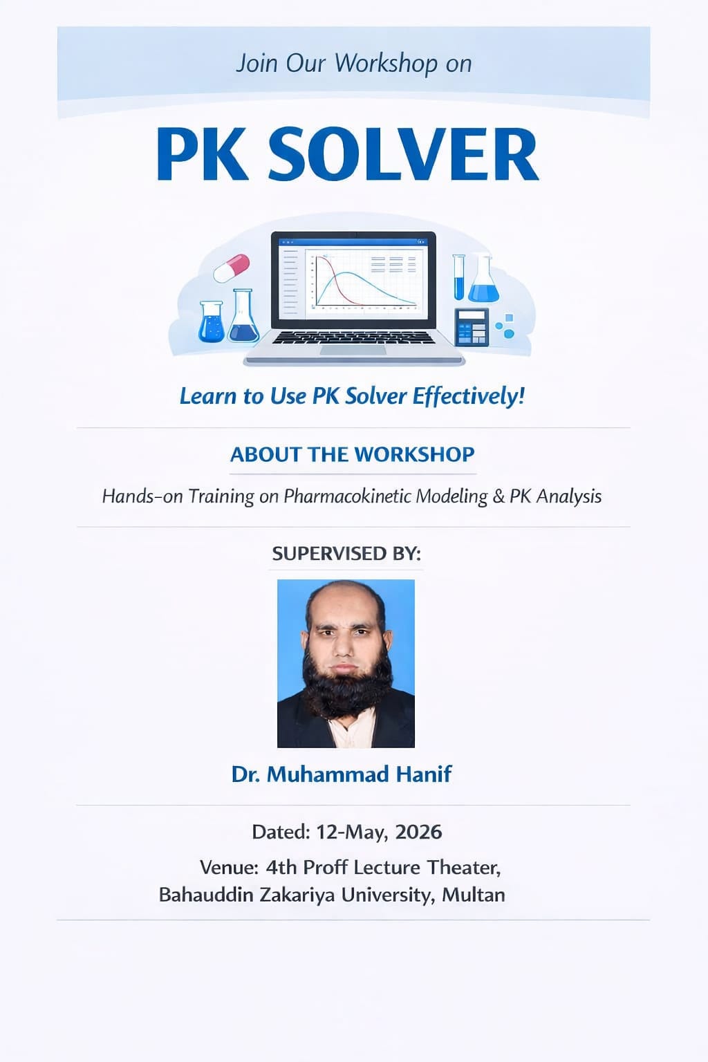 This hands-on training workshop focuses on *PK Solver*, a powerful and user-friendly add-in for Microsoft Excel widely used for non-compartmental and compartmental pharmacokinetic (PK) analysis. Participants will learn to effectively model drug concentration-time data, perform PK parameter estimation, generate concentration-time profiles, and interpret results for research, formulation development, and clinical applications.