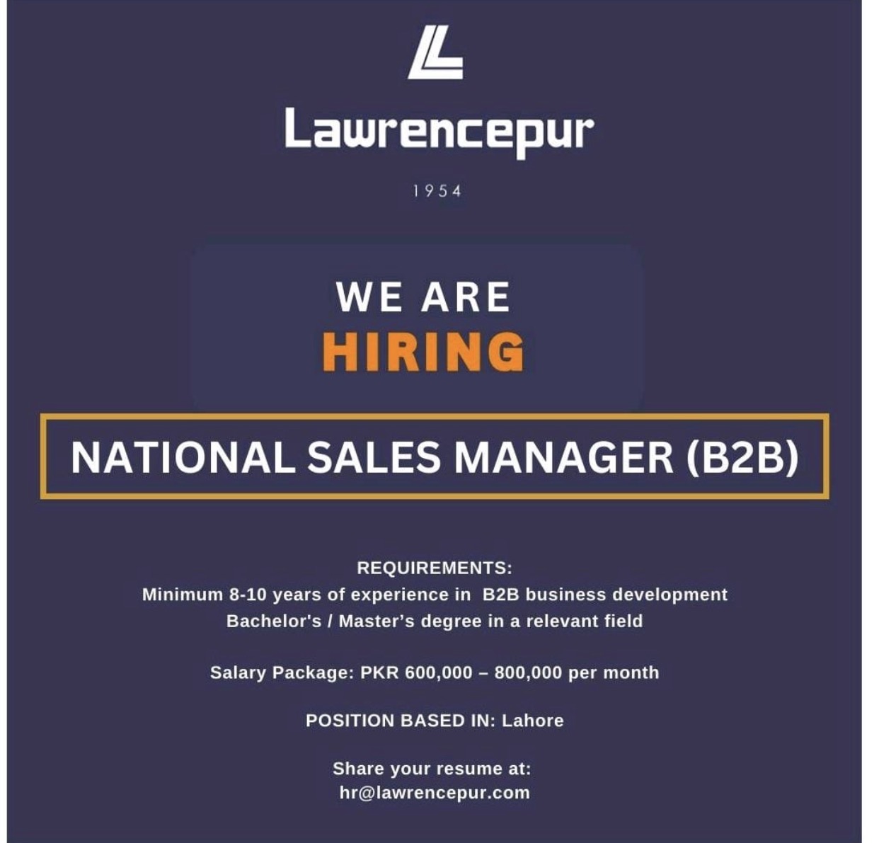 Lawrencepur textiles is hiring National Sales Manager (B2B). Interested candidates with relevant qualifications and 8-10 years of experience may apply. Details are attached.