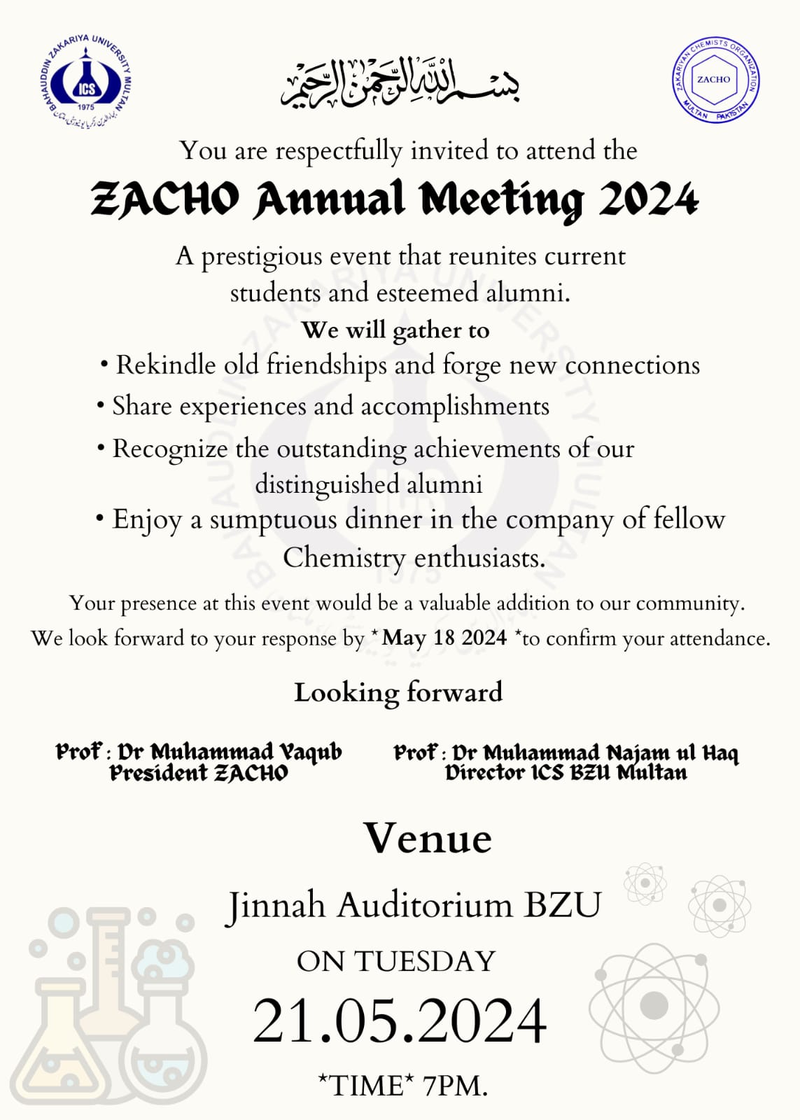 A general body meeting of ZACHO, Zakarian Chemists Organization, an alumni of old Zakariyans held under the chairmanship of Prof Dr Muhammad Najam-ul-haq, Director Institute of Chemical Sciences and Prof Dr Muhammad Yaqub President ZACHO in the Committee Room of ICS. All the agenda items were unanimously approved by the body, which includes the distribution of scholarships to needy students, medals to position holders of BS & M.Phil, and shields to PhDs. It is emphasized to increase the coordination between senior alumni and present students for internship and job placement. It is also decided by the body to conduct the annual meeting of ZACHO on 20-21 May, 2024 in which elections of new body are to be conducted.