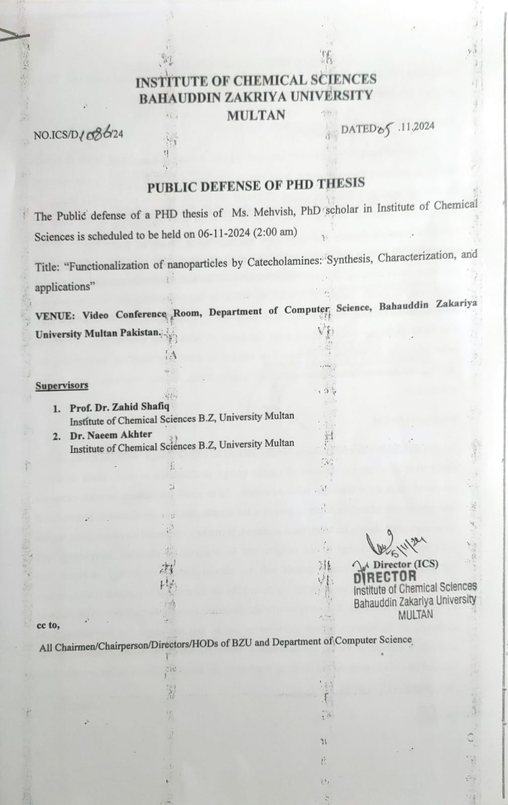 The Public defense of a PhD Thesis of Ms. Mehvish, PhD Scholar in Institute of Chemical Sciences is scheduled to be held on November 06, 2024 at 2pm.