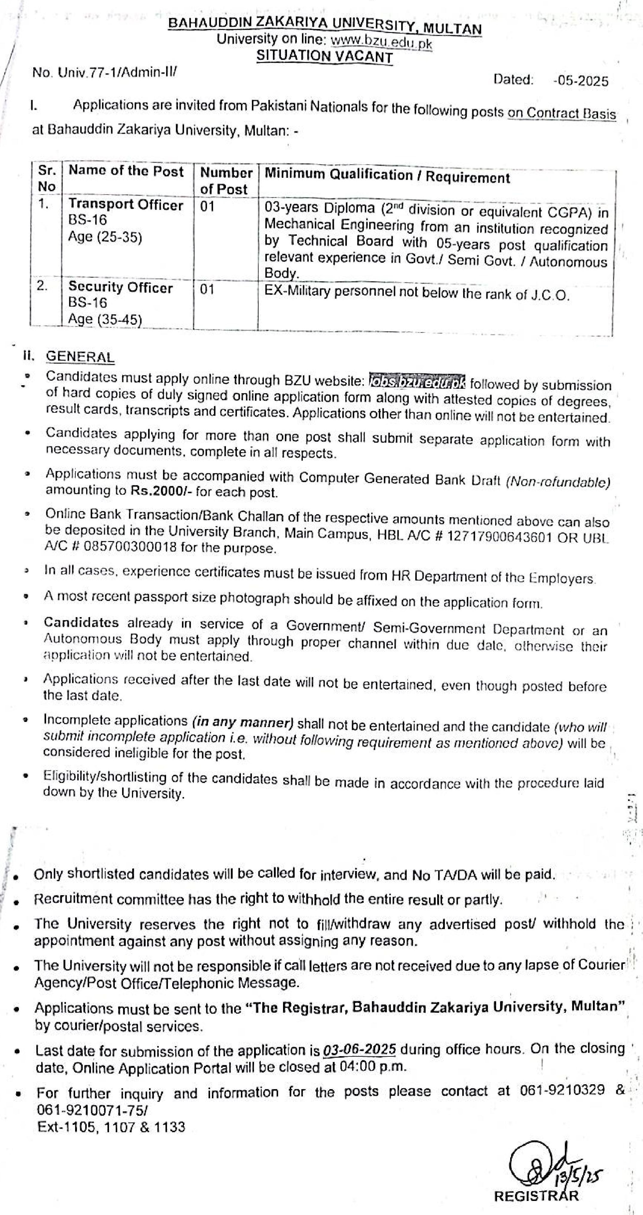 Situation Vacant – Transport Officer and Security Officer (Application Deadline: 03-06-2025)