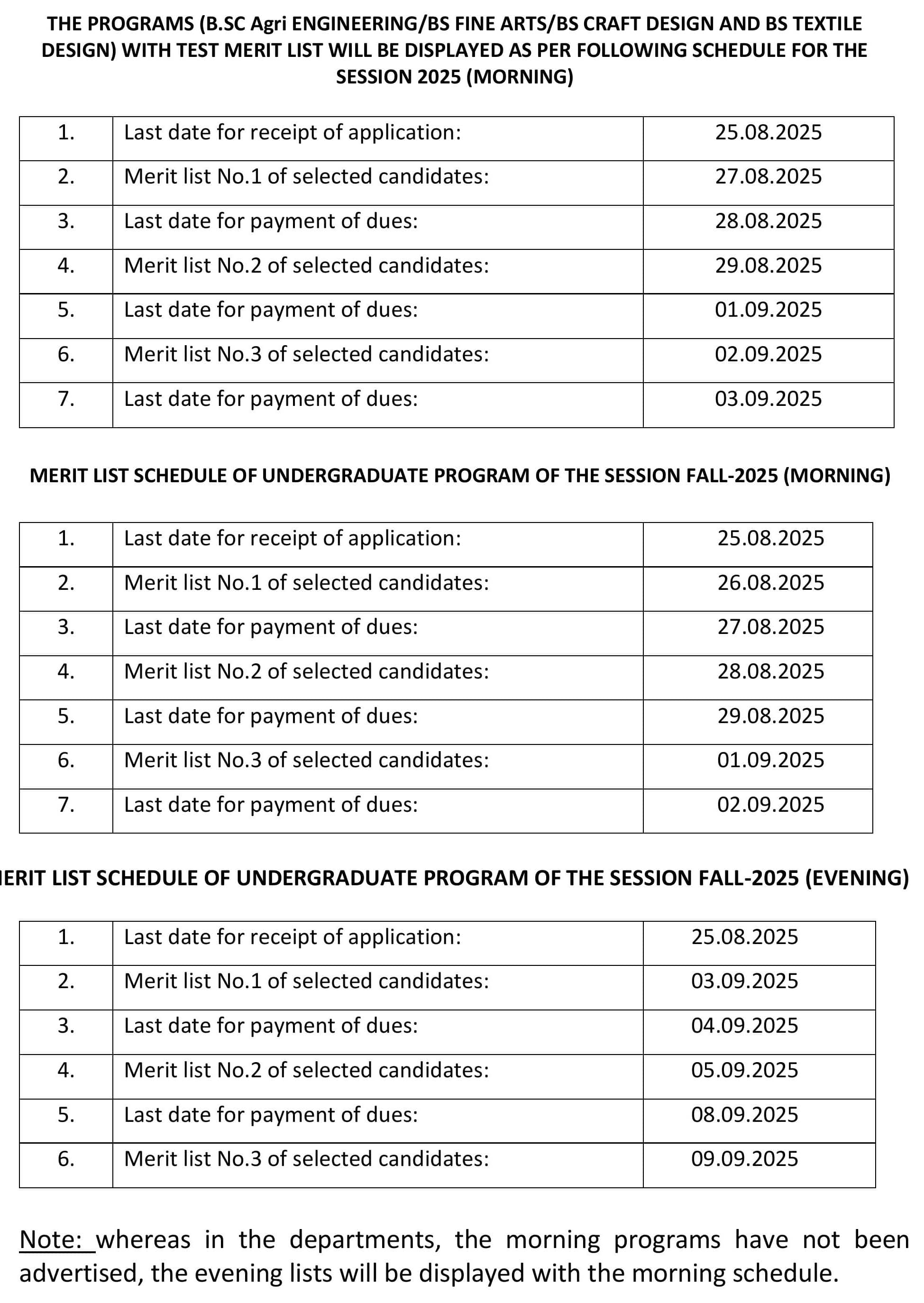 Merit List Schedule Undergraduate Admissions Fall 2025 - Call-2 (Morning & Evening)