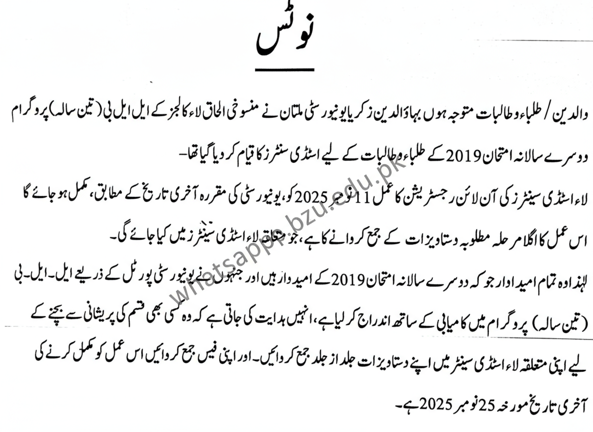 BZU Multan has finalized study centers for candidates of the LL.B (3‑year) 2019 second annual examination. Verification and data correction will be completed by 11 November 2025 per the University’s schedule. All required documents must be submitted promptly; incomplete or incorrect entries will be corrected at the respective study centers. Candidates are advised to review their information urgently and follow the notified process to avoid issues. Final notification date: 25 November 2025.