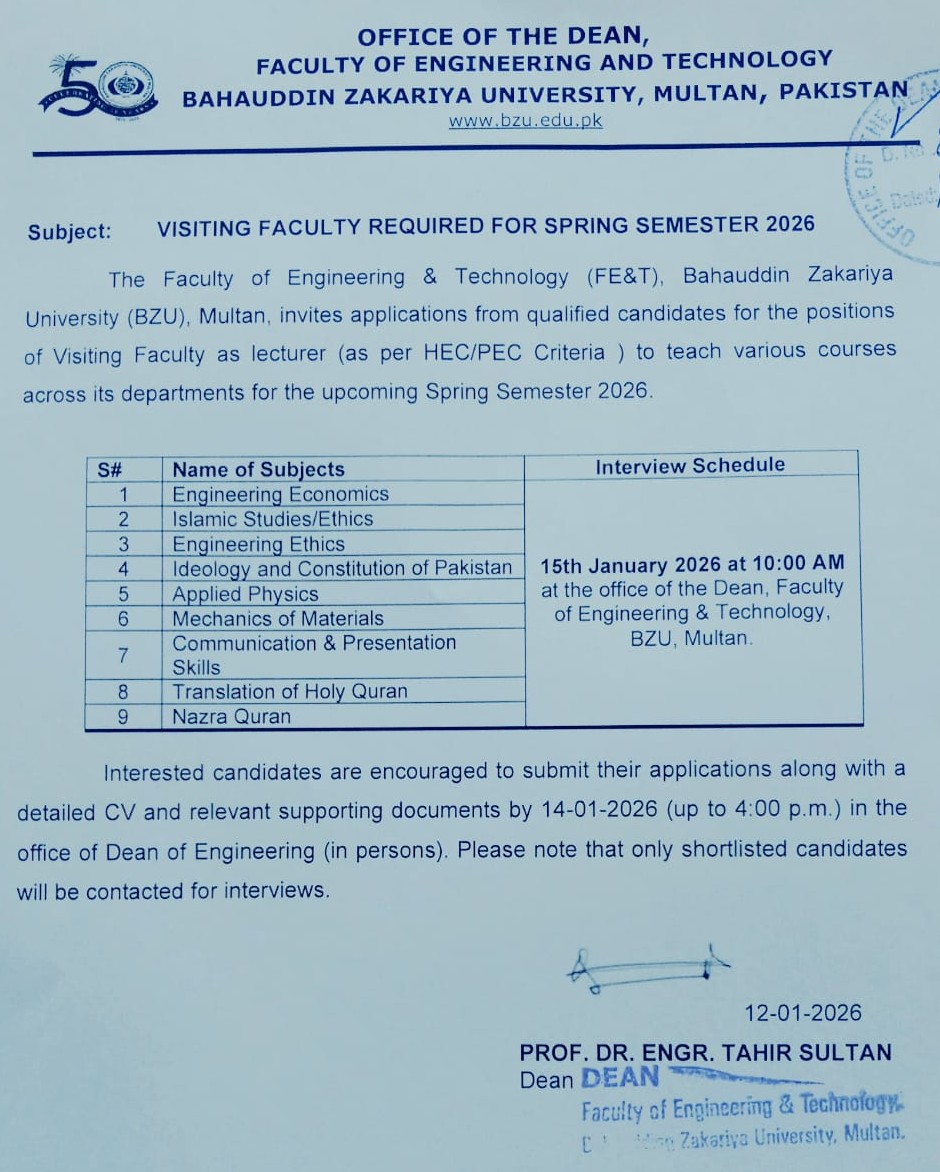 Visiting Faculty Required in Faculty of Engineering and Technology for Spring Semester, 2026