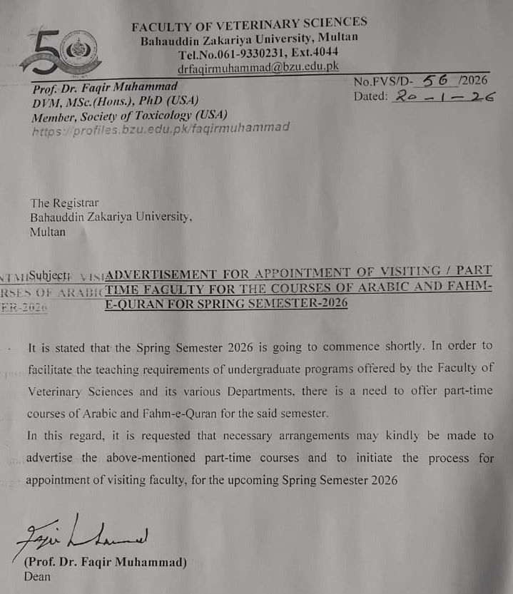 Part Time Faculty required for Arabic and Fahm-e-Quran Courses in Faculty of Veterinary Sciences, Spring, 2026