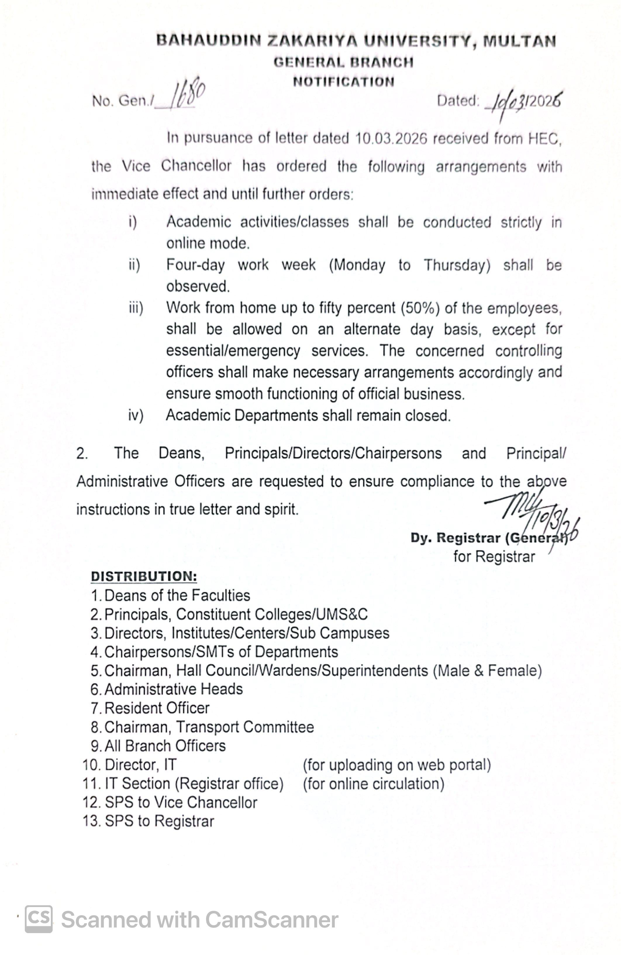 Bahauddin Zakariya University, Multan has issued a notification following directions from the Higher Education Commission of Pakistan. Academic classes will be conducted strictly in online mode, while the university will observe a four-day work week (Monday to Thursday). Up to 50% of employees will work from home on alternate days, except those providing essential or emergency services. Academic departments will remain closed until further orders.
