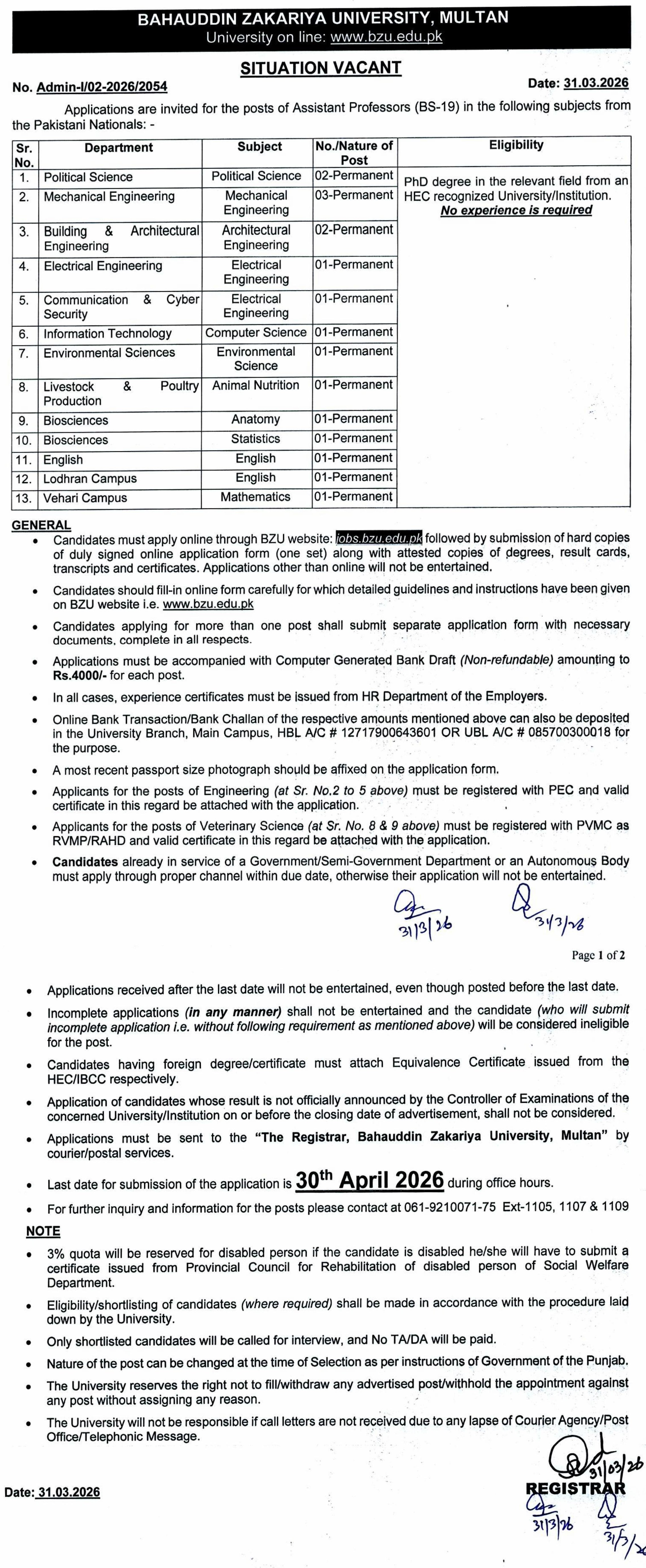 Bahauddin Zakariya University, Multan has announced vacancies for the post of Assistant Professor (BS-19) in various academic disciplines. Applications are invited from Pakistani nationals holding a relevant PhD degree from an HEC-recognized university or institution, while no prior experience is required. The deadline for submission of applications is 30 April 2026.