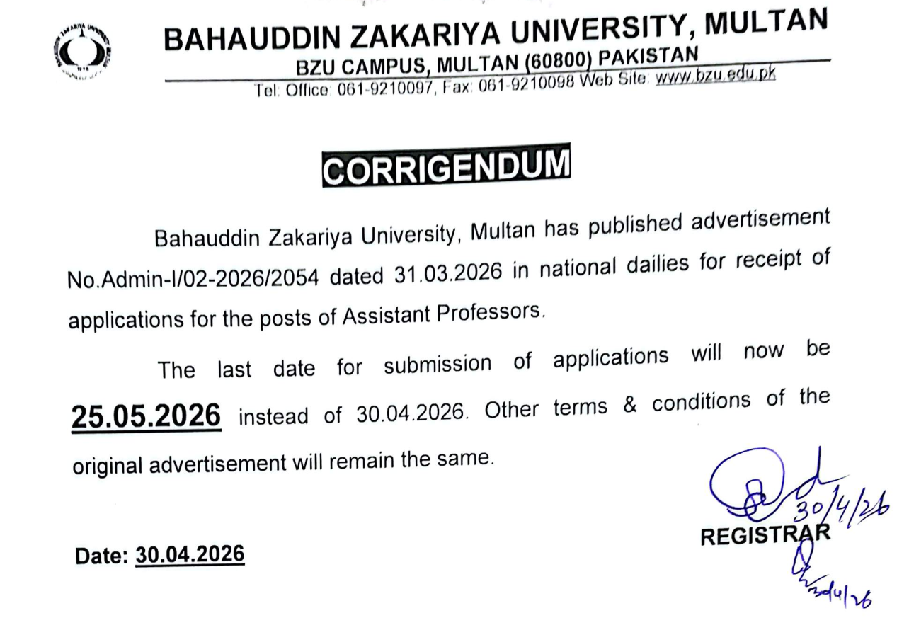 Bahauddin Zakariya University, Multan has issued a corrigendum regarding its previously advertised faculty positions. The university has extended the deadline for submission of applications for Assistant Professor posts to May 25, 2026, replacing the earlier deadline of April 30, 2026.