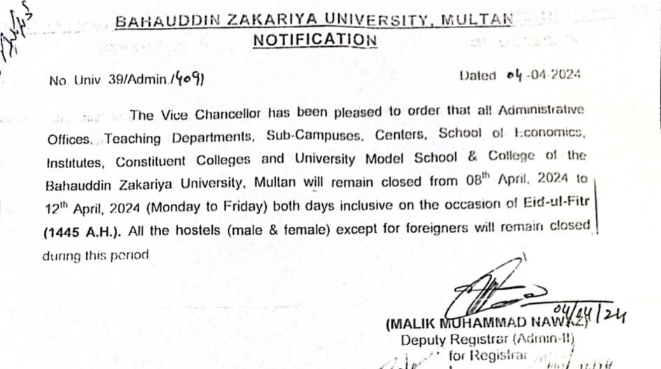 Eid-ul-Fiter Holidays Notification